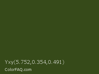 Yxy 5.752,0.354,0.491 Color is a very dark green color and the nearest color is Clover #384910. Hex code #364a19 and RGB value is rgb(54,74,25). In RGB color space, this color is composed of 21% red, 29% green, 10% blue, In CMYK color space, this color is composed of 27% cyan, 0% magenta, 66% yellow , 71% black , In HSL color space, this color has a hue angle of 84° , 49% saturation and 19% lightness.