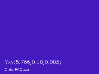 Yxy 5.766,0.18,0.085 Color is a normal indigo color and the nearest color is Interdimensional Blue #360ccc. Hex code #441abf and RGB value is rgb(68,26,191). In RGB color space, this color is composed of 27% red, 10% green, 75% blue, In CMYK color space, this color is composed of 64% cyan, 86% magenta, 0% yellow , 25% black , In HSL color space, this color has a hue angle of 255° , 76% saturation and 43% lightness.