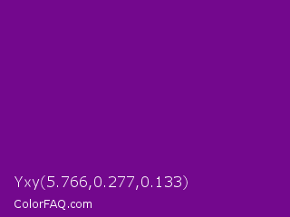 Yxy 5.766,0.277,0.133 Color is a dark purple color and the nearest color is Purple #660099. Hex code #73088d and RGB value is rgb(115,8,141). In RGB color space, this color is composed of 45% red, 3% green, 55% blue, In CMYK color space, this color is composed of 18% cyan, 94% magenta, 0% yellow , 45% black , In HSL color space, this color has a hue angle of 288° , 89% saturation and 29% lightness.