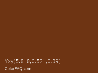 Yxy 5.818,0.521,0.39 Color is a dark orange color and the nearest color is Hairy Heath #6b2a14. Hex code #6e3413 and RGB value is rgb(110,52,19). In RGB color space, this color is composed of 43% red, 20% green, 7% blue, In CMYK color space, this color is composed of 0% cyan, 53% magenta, 83% yellow , 57% black , In HSL color space, this color has a hue angle of 22° , 71% saturation and 25% lightness.
