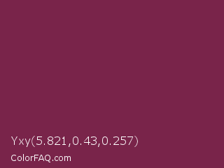 Yxy 5.821,0.43,0.257 Color is a normal rose color and the nearest color is Pansy Purple #78184a. Hex code #79244a and RGB value is rgb(121,36,74). In RGB color space, this color is composed of 47% red, 14% green, 29% blue, In CMYK color space, this color is composed of 0% cyan, 70% magenta, 39% yellow , 53% black , In HSL color space, this color has a hue angle of 333° , 54% saturation and 31% lightness.