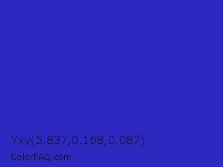 Yxy 5.837,0.168,0.087 Color is a normal indigo color and the nearest color is Governor Bay #2f3cb3. Hex code #2d28bf and RGB value is rgb(45,40,191). In RGB color space, this color is composed of 18% red, 16% green, 75% blue, In CMYK color space, this color is composed of 76% cyan, 79% magenta, 0% yellow , 25% black , In HSL color space, this color has a hue angle of 242° , 65% saturation and 45% lightness.