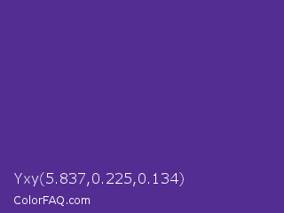 Yxy 5.837,0.225,0.134 Color is a normal violet color and the nearest color is Blue Magenta Violet #553592. Hex code #542d92 and RGB value is rgb(84,45,146). In RGB color space, this color is composed of 33% red, 18% green, 57% blue, In CMYK color space, this color is composed of 42% cyan, 69% magenta, 0% yellow , 43% black , In HSL color space, this color has a hue angle of 263° , 53% saturation and 37% lightness.