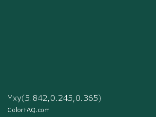 Yxy 5.842,0.245,0.365 Color is a very dark cyan color and the nearest color is Brunswick Green #1b4d3e. Hex code #124d43 and RGB value is rgb(18,77,67). In RGB color space, this color is composed of 7% red, 30% green, 26% blue, In CMYK color space, this color is composed of 77% cyan, 0% magenta, 13% yellow , 70% black , In HSL color space, this color has a hue angle of 170° , 62% saturation and 19% lightness.
