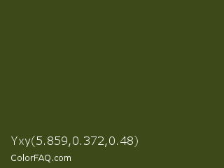 Yxy 5.859,0.372,0.48 Color is a very dark lime color and the nearest color is Clover #384910. Hex code #3e4919 and RGB value is rgb(62,73,25). In RGB color space, this color is composed of 24% red, 29% green, 10% blue, In CMYK color space, this color is composed of 15% cyan, 0% magenta, 66% yellow , 71% black , In HSL color space, this color has a hue angle of 74° , 49% saturation and 19% lightness.