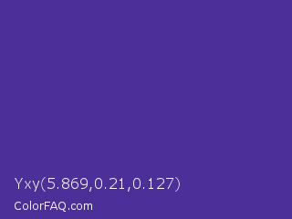 Yxy 5.869,0.21,0.127 Color is a normal indigo color and the nearest color is Daisy Bush #4f2398. Hex code #4c2f99 and RGB value is rgb(76,47,153). In RGB color space, this color is composed of 30% red, 18% green, 60% blue, In CMYK color space, this color is composed of 50% cyan, 69% magenta, 0% yellow , 40% black , In HSL color space, this color has a hue angle of 256° , 53% saturation and 39% lightness.