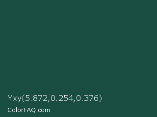 Yxy 5.872,0.254,0.376 Color is a very dark cyan color and the nearest color is Brunswick Green #1b4d3e. Hex code #194d40 and RGB value is rgb(25,77,64). In RGB color space, this color is composed of 10% red, 30% green, 25% blue, In CMYK color space, this color is composed of 68% cyan, 0% magenta, 17% yellow , 70% black , In HSL color space, this color has a hue angle of 165° , 51% saturation and 20% lightness.