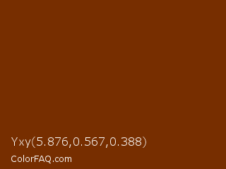 Yxy 5.876,0.567,0.388 Color is a dark orange color and the nearest color is Red Beech #7b3801. Hex code #772e00 and RGB value is rgb(119,46,0). In RGB color space, this color is composed of 47% red, 18% green, 0% blue, In CMYK color space, this color is composed of 0% cyan, 61% magenta, 100% yellow , 53% black , In HSL color space, this color has a hue angle of 23° , 100% saturation and 23% lightness.