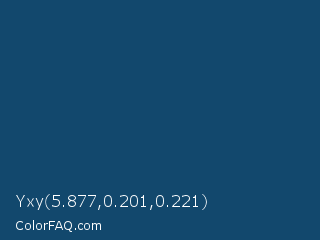 Yxy 5.877,0.201,0.221 Color is a dark blue color and the nearest color is Chathams Blue #175579. Hex code #12486d and RGB value is rgb(18,72,109). In RGB color space, this color is composed of 7% red, 28% green, 43% blue, In CMYK color space, this color is composed of 83% cyan, 34% magenta, 0% yellow , 57% black , In HSL color space, this color has a hue angle of 204° , 72% saturation and 25% lightness.