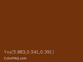 Yxy 5.883,0.541,0.391 Color is a dark orange color and the nearest color is Peanut #782f16. Hex code #72320b and RGB value is rgb(114,50,11). In RGB color space, this color is composed of 45% red, 20% green, 4% blue, In CMYK color space, this color is composed of 0% cyan, 56% magenta, 90% yellow , 55% black , In HSL color space, this color has a hue angle of 23° , 82% saturation and 25% lightness.
