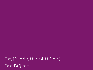 Yxy 5.885,0.354,0.187 Color is a dark magenta color and the nearest color is Midnight #702670. Hex code #7b176b and RGB value is rgb(123,23,107). In RGB color space, this color is composed of 48% red, 9% green, 42% blue, In CMYK color space, this color is composed of 0% cyan, 81% magenta, 13% yellow , 52% black , In HSL color space, this color has a hue angle of 310° , 68% saturation and 29% lightness.