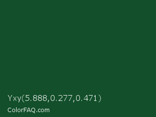 Yxy 5.888,0.277,0.471 Color is a very dark green color and the nearest color is Cal Poly Pomona Green #1e4d2b. Hex code #124f2a and RGB value is rgb(18,79,42). In RGB color space, this color is composed of 7% red, 31% green, 16% blue, In CMYK color space, this color is composed of 77% cyan, 0% magenta, 47% yellow , 69% black , In HSL color space, this color has a hue angle of 144° , 63% saturation and 19% lightness.
