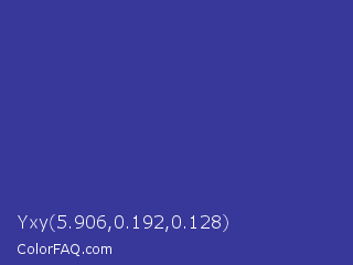 Yxy 5.906,0.192,0.128 Color is a normal indigo color and the nearest color is Blue Pigment #333399. Hex code #38379a and RGB value is rgb(56,55,154). In RGB color space, this color is composed of 22% red, 22% green, 60% blue, In CMYK color space, this color is composed of 64% cyan, 64% magenta, 0% yellow , 40% black , In HSL color space, this color has a hue angle of 241° , 47% saturation and 41% lightness.