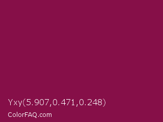 Yxy 5.907,0.471,0.248 Color is a dark rose color and the nearest color is Rose Bud Cherry #800b47. Hex code #860f48 and RGB value is rgb(134,15,72). In RGB color space, this color is composed of 53% red, 6% green, 28% blue, In CMYK color space, this color is composed of 0% cyan, 89% magenta, 46% yellow , 47% black , In HSL color space, this color has a hue angle of 331° , 80% saturation and 29% lightness.