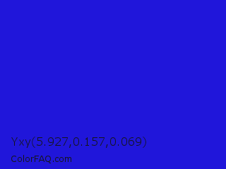 Yxy 5.927,0.157,0.069 Color is a normal indigo color and the nearest color is Bluebonnet #1c1cf0. Hex code #2016da and RGB value is rgb(32,22,218). In RGB color space, this color is composed of 13% red, 9% green, 85% blue, In CMYK color space, this color is composed of 85% cyan, 90% magenta, 0% yellow , 15% black , In HSL color space, this color has a hue angle of 243° , 82% saturation and 47% lightness.