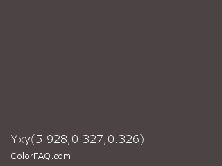 Yxy 5.928,0.327,0.326 Color is a dark red color and the nearest color is Tundora #4a4244. Hex code #4b4344 and RGB value is rgb(75,67,68). In RGB color space, this color is composed of 29% red, 26% green, 27% blue, In CMYK color space, this color is composed of 0% cyan, 11% magenta, 9% yellow , 71% black , In HSL color space, this color has a hue angle of 353° , 6% saturation and 28% lightness.