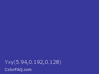 Yxy 5.94,0.192,0.128 Color is a normal indigo color and the nearest color is Blue Pigment #333399. Hex code #38379b and RGB value is rgb(56,55,155). In RGB color space, this color is composed of 22% red, 22% green, 61% blue, In CMYK color space, this color is composed of 64% cyan, 65% magenta, 0% yellow , 39% black , In HSL color space, this color has a hue angle of 241° , 48% saturation and 41% lightness.