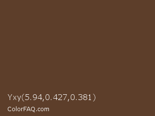 Yxy 5.94,0.427,0.381 Color is a dark orange color and the nearest color is Irish Coffee #5f3d26. Hex code #5d3e2a and RGB value is rgb(93,62,42). In RGB color space, this color is composed of 36% red, 24% green, 16% blue, In CMYK color space, this color is composed of 0% cyan, 33% magenta, 55% yellow , 64% black , In HSL color space, this color has a hue angle of 24° , 38% saturation and 26% lightness.