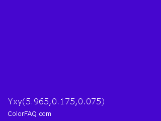 Yxy 5.965,0.175,0.075 Color is a normal indigo color and the nearest color is Interdimensional Blue #360ccc. Hex code #4606cf and RGB value is rgb(70,6,207). In RGB color space, this color is composed of 27% red, 2% green, 81% blue, In CMYK color space, this color is composed of 66% cyan, 97% magenta, 0% yellow , 19% black , In HSL color space, this color has a hue angle of 259° , 94% saturation and 42% lightness.