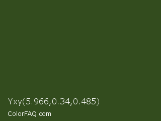 Yxy 5.966,0.34,0.485 Color is a very dark green color and the nearest color is Clover #384910. Hex code #334c1e and RGB value is rgb(51,76,30). In RGB color space, this color is composed of 20% red, 30% green, 12% blue, In CMYK color space, this color is composed of 33% cyan, 0% magenta, 61% yellow , 70% black , In HSL color space, this color has a hue angle of 93° , 43% saturation and 21% lightness.