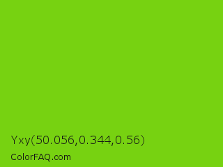 Yxy 50.056,0.344,0.56 Color is a normal green color and the nearest color is Lima #76bd17. Hex code #77d211 and RGB value is rgb(119,210,17). In RGB color space, this color is composed of 47% red, 82% green, 7% blue, In CMYK color space, this color is composed of 43% cyan, 0% magenta, 92% yellow , 18% black , In HSL color space, this color has a hue angle of 88° , 85% saturation and 45% lightness.