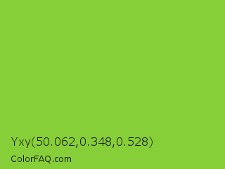 Yxy 50.062,0.348,0.528 Color is a normal green color and the nearest color is Atlantis #97cd2d. Hex code #87cf39 and RGB value is rgb(135,207,57). In RGB color space, this color is composed of 53% red, 81% green, 22% blue, In CMYK color space, this color is composed of 35% cyan, 0% magenta, 72% yellow , 19% black , In HSL color space, this color has a hue angle of 89° , 61% saturation and 52% lightness.