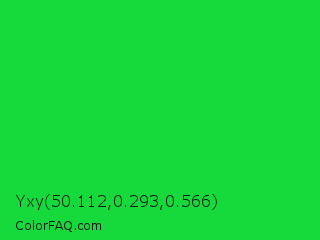 Yxy 50.112,0.293,0.566 Color is a normal green color and the nearest color is Malachite #0bda51. Hex code #16d93b and RGB value is rgb(22,217,59). In RGB color space, this color is composed of 9% red, 85% green, 23% blue, In CMYK color space, this color is composed of 90% cyan, 0% magenta, 73% yellow , 15% black , In HSL color space, this color has a hue angle of 131° , 82% saturation and 47% lightness.