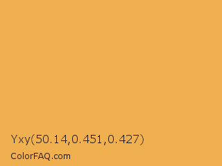 Yxy 50.14,0.451,0.427 Color is a light orange color and the nearest color is Maximum Yellow Red #f2ba49. Hex code #f0b04f and RGB value is rgb(240,176,79). In RGB color space, this color is composed of 94% red, 69% green, 31% blue, In CMYK color space, this color is composed of 0% cyan, 27% magenta, 67% yellow , 6% black , In HSL color space, this color has a hue angle of 36° , 84% saturation and 63% lightness.