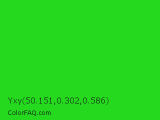 Yxy 50.151,0.302,0.586 Color is a normal green color and the nearest color is Lime Green #32cd32. Hex code #25d91f and RGB value is rgb(37,217,31). In RGB color space, this color is composed of 15% red, 85% green, 12% blue, In CMYK color space, this color is composed of 83% cyan, 0% magenta, 86% yellow , 15% black , In HSL color space, this color has a hue angle of 118° , 75% saturation and 49% lightness.