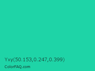 Yxy 50.153,0.247,0.399 Color is a normal cyan color and the nearest color is Shamrock #33cc99. Hex code #1ed4a7 and RGB value is rgb(30,212,167). In RGB color space, this color is composed of 12% red, 83% green, 65% blue, In CMYK color space, this color is composed of 86% cyan, 0% magenta, 21% yellow , 17% black , In HSL color space, this color has a hue angle of 165° , 75% saturation and 47% lightness.