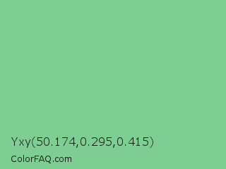 Yxy 50.174,0.295,0.415 Color is a light green color and the nearest color is De York #7ac488. Hex code #7ecd92 and RGB value is rgb(126,205,146). In RGB color space, this color is composed of 49% red, 80% green, 57% blue, In CMYK color space, this color is composed of 39% cyan, 0% magenta, 29% yellow , 20% black , In HSL color space, this color has a hue angle of 135° , 44% saturation and 65% lightness.
