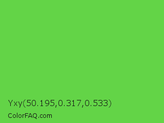 Yxy 50.195,0.317,0.533 Color is a normal green color and the nearest color is Mantis #74c365. Hex code #63d447 and RGB value is rgb(99,212,71). In RGB color space, this color is composed of 39% red, 83% green, 28% blue, In CMYK color space, this color is composed of 53% cyan, 0% magenta, 67% yellow , 17% black , In HSL color space, this color has a hue angle of 108° , 62% saturation and 55% lightness.