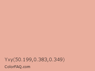 Yxy 50.199,0.383,0.349 Color is a light red color and the nearest color is Pastel Pink #dea5a4. Hex code #eaae9d and RGB value is rgb(234,174,157). In RGB color space, this color is composed of 92% red, 68% green, 62% blue, In CMYK color space, this color is composed of 0% cyan, 26% magenta, 33% yellow , 8% black , In HSL color space, this color has a hue angle of 13° , 65% saturation and 77% lightness.