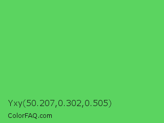 Yxy 50.207,0.302,0.505 Color is a normal green color and the nearest color is Emerald #50c878. Hex code #5bd460 and RGB value is rgb(91,212,96). In RGB color space, this color is composed of 36% red, 83% green, 38% blue, In CMYK color space, this color is composed of 57% cyan, 0% magenta, 55% yellow , 17% black , In HSL color space, this color has a hue angle of 122° , 58% saturation and 59% lightness.