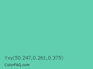 Yxy 50.247,0.261,0.375 Color is a normal green color and the nearest color is Medium Aquamarine #66ddaa. Hex code #60cfb0 and RGB value is rgb(96,207,176). In RGB color space, this color is composed of 38% red, 81% green, 69% blue, In CMYK color space, this color is composed of 54% cyan, 0% magenta, 15% yellow , 19% black , In HSL color space, this color has a hue angle of 163° , 54% saturation and 59% lightness.