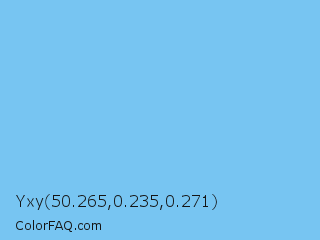 Yxy 50.265,0.235,0.271 Color is a light blue color and the nearest color is Malibu #7dc8f7. Hex code #77c5f2 and RGB value is rgb(119,197,242). In RGB color space, this color is composed of 47% red, 77% green, 95% blue, In CMYK color space, this color is composed of 51% cyan, 19% magenta, 0% yellow , 5% black , In HSL color space, this color has a hue angle of 202° , 83% saturation and 71% lightness.