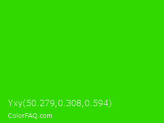 Yxy 50.279,0.308,0.594 Color is a normal green color and the nearest color is Harlequin Green #46cb18. Hex code #31d900 and RGB value is rgb(49,217,0). In RGB color space, this color is composed of 19% red, 85% green, 0% blue, In CMYK color space, this color is composed of 77% cyan, 0% magenta, 100% yellow , 15% black , In HSL color space, this color has a hue angle of 106° , 100% saturation and 43% lightness.