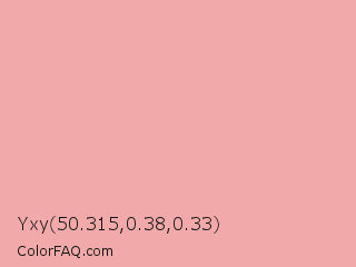 Yxy 50.315,0.38,0.33 Color is a light red color and the nearest color is Rose Bud #fbb2a3. Hex code #f1aaa9 and RGB value is rgb(241,170,169). In RGB color space, this color is composed of 95% red, 67% green, 66% blue, In CMYK color space, this color is composed of 0% cyan, 29% magenta, 30% yellow , 5% black , In HSL color space, this color has a hue angle of 1° , 72% saturation and 80% lightness.