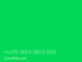 Yxy 50.365,0.282,0.534 Color is a normal green color and the nearest color is Malachite #0bda51. Hex code #04d957 and RGB value is rgb(4,217,87). In RGB color space, this color is composed of 2% red, 85% green, 34% blue, In CMYK color space, this color is composed of 98% cyan, 0% magenta, 60% yellow , 15% black , In HSL color space, this color has a hue angle of 143° , 96% saturation and 43% lightness.