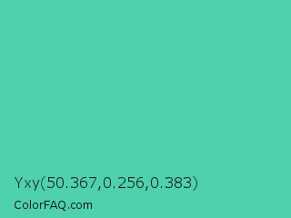 Yxy 50.367,0.256,0.383 Color is a normal green color and the nearest color is Eucalyptus #44d7a8. Hex code #50d1ad and RGB value is rgb(80,209,173). In RGB color space, this color is composed of 31% red, 82% green, 68% blue, In CMYK color space, this color is composed of 62% cyan, 0% magenta, 17% yellow , 18% black , In HSL color space, this color has a hue angle of 163° , 58% saturation and 57% lightness.