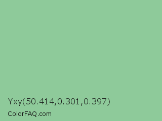 Yxy 50.414,0.301,0.397 Color is a light green color and the nearest color is Eton Blue #96c8a2. Hex code #8eca9a and RGB value is rgb(142,202,154). In RGB color space, this color is composed of 56% red, 79% green, 60% blue, In CMYK color space, this color is composed of 30% cyan, 0% magenta, 24% yellow , 21% black , In HSL color space, this color has a hue angle of 132° , 36% saturation and 67% lightness.
