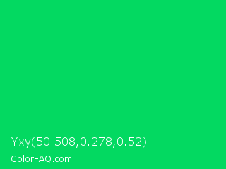 Yxy 50.508,0.278,0.52 Color is a normal green color and the nearest color is Malachite #0bda51. Hex code #03d961 and RGB value is rgb(3,217,97). In RGB color space, this color is composed of 1% red, 85% green, 38% blue, In CMYK color space, this color is composed of 99% cyan, 0% magenta, 55% yellow , 15% black , In HSL color space, this color has a hue angle of 146° , 97% saturation and 43% lightness.