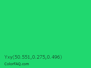 Yxy 50.551,0.275,0.496 Color is a normal green color and the nearest color is UFO Green #3cd070. Hex code #20d86f and RGB value is rgb(32,216,111). In RGB color space, this color is composed of 13% red, 85% green, 44% blue, In CMYK color space, this color is composed of 85% cyan, 0% magenta, 49% yellow , 15% black , In HSL color space, this color has a hue angle of 146° , 74% saturation and 49% lightness.