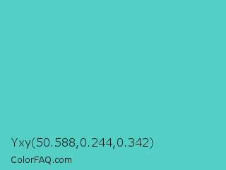 Yxy 50.588,0.244,0.342 Color is a normal cyan color and the nearest color is Medium Turquoise #48d1cc. Hex code #53cfc6 and RGB value is rgb(83,207,198). In RGB color space, this color is composed of 33% red, 81% green, 78% blue, In CMYK color space, this color is composed of 60% cyan, 0% magenta, 4% yellow , 19% black , In HSL color space, this color has a hue angle of 176° , 56% saturation and 57% lightness.