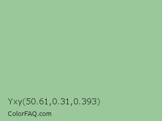 Yxy 50.61,0.31,0.393 Color is a light green color and the nearest color is Eton Blue #96c8a2. Hex code #9ac89a and RGB value is rgb(154,200,154). In RGB color space, this color is composed of 60% red, 78% green, 60% blue, In CMYK color space, this color is composed of 23% cyan, 0% magenta, 23% yellow , 22% black , In HSL color space, this color has a hue angle of 120° , 29% saturation and 69% lightness.