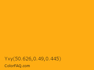 Yxy 50.626,0.49,0.445 Color is a normal orange color and the nearest color is Sun #fbac13. Hex code #feac12 and RGB value is rgb(254,172,18). In RGB color space, this color is composed of 100% red, 67% green, 7% blue, In CMYK color space, this color is composed of 0% cyan, 32% magenta, 93% yellow , 0% black , In HSL color space, this color has a hue angle of 39° , 99% saturation and 53% lightness.