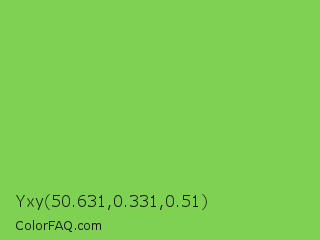 Yxy 50.631,0.331,0.51 Color is a normal green color and the nearest color is Mantis #74c365. Hex code #7ed151 and RGB value is rgb(126,209,81). In RGB color space, this color is composed of 49% red, 82% green, 32% blue, In CMYK color space, this color is composed of 40% cyan, 0% magenta, 61% yellow , 18% black , In HSL color space, this color has a hue angle of 99° , 58% saturation and 57% lightness.