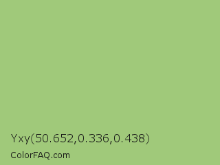 Yxy 50.652,0.336,0.438 Color is a light green color and the nearest color is Pistachio #93c572. Hex code #a0c97a and RGB value is rgb(160,201,122). In RGB color space, this color is composed of 63% red, 79% green, 48% blue, In CMYK color space, this color is composed of 20% cyan, 0% magenta, 39% yellow , 21% black , In HSL color space, this color has a hue angle of 91° , 42% saturation and 63% lightness.