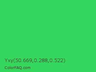 Yxy 50.669,0.288,0.522 Color is a normal green color and the nearest color is UFO Green #3cd070. Hex code #35d85c and RGB value is rgb(53,216,92). In RGB color space, this color is composed of 21% red, 85% green, 36% blue, In CMYK color space, this color is composed of 75% cyan, 0% magenta, 57% yellow , 15% black , In HSL color space, this color has a hue angle of 134° , 68% saturation and 53% lightness.