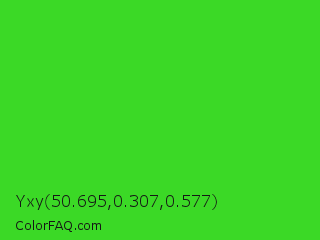 Yxy 50.695,0.307,0.577 Color is a normal green color and the nearest color is Lime Green #32cd32. Hex code #3bd926 and RGB value is rgb(59,217,38). In RGB color space, this color is composed of 23% red, 85% green, 15% blue, In CMYK color space, this color is composed of 73% cyan, 0% magenta, 82% yellow , 15% black , In HSL color space, this color has a hue angle of 113° , 70% saturation and 50% lightness.